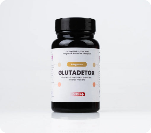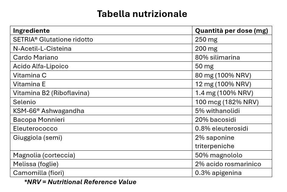 GLUTADETOX fornisce SETRIA® Glutatione ridotto (250 mg), N-Acetil-L-Cisteina (200 mg), Cardo Mariano (Silybum marianum) estratto di frutto titolato all’80% in silimarina, Acido Alfa-Lipoico (50 mg), Vitamina C (80 mg – 100% NRV), Vitamina E (12 mg – 100% NRV), Vitamina B2 (1,4 mg – 100% NRV) e Selenio (100 mcg – 182% NRV).