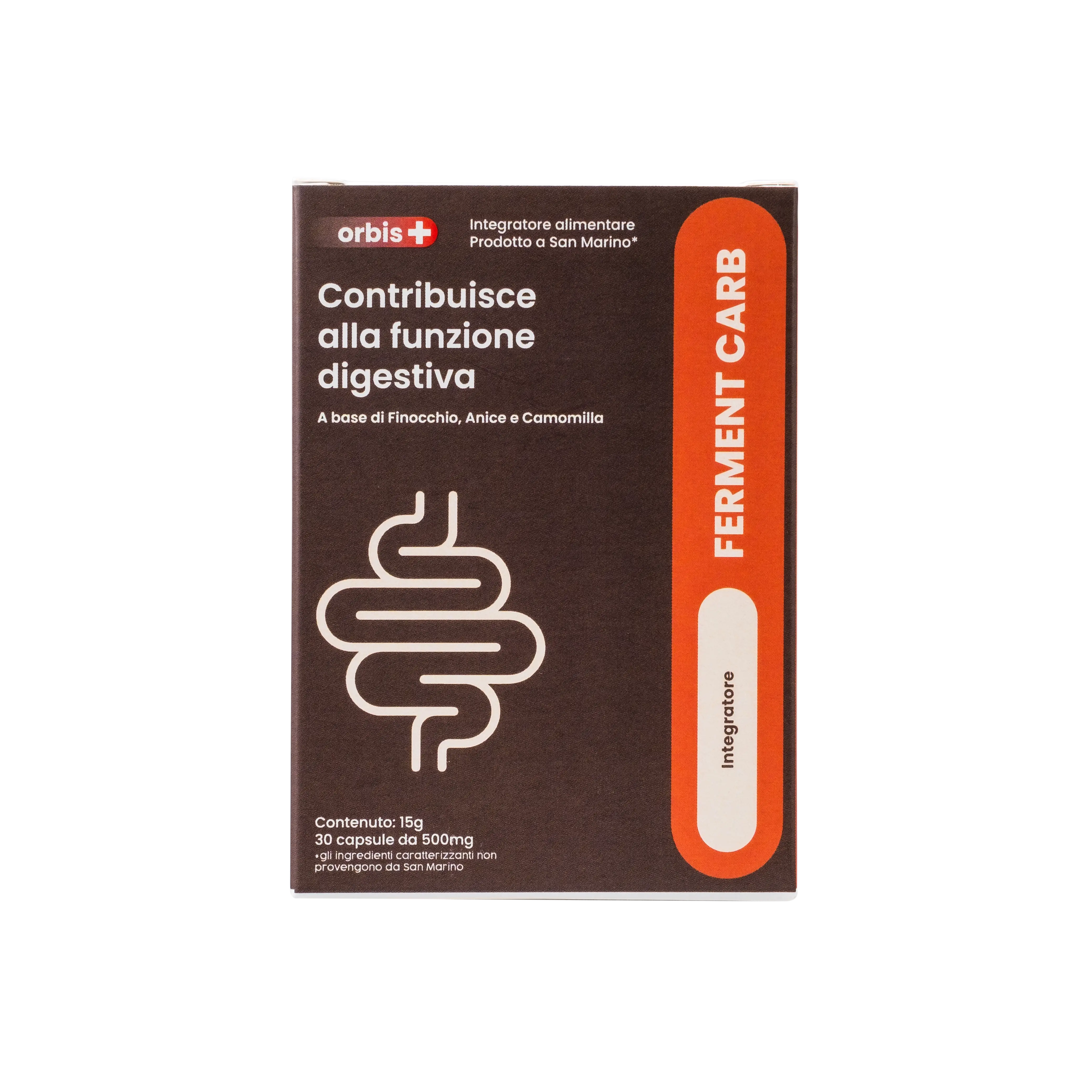 FERMENTCARB contiene Finocchio (Foeniculum vulgare Mill.) frutti estratto secco tit. 0,5 percento in olio essenziale; Carbone vegetale; involucro: capsula di gelatina alimentare; Anice verde (Pimpinella anisum L.) frutti estratto secco; Melissa (Melissa officinalis L.) foglie polvere micronizzata; Melissa (Melissa officinalis L.) foglie estratto secco tit. 2% acido rosmarinico; miscela di enzimi da substrati vegetali fermentati (amilasi, proteasi, glucoamilasi, lipasi, cellulasi, lattasi, pectinasi); Camomilla (Matricaria chamomilla L.) fiori estratto secco tit. 0,3% apigenina; Lactobacillus acidophilus SGL11; agente antiagglomerante: sali di magnesio degli acidi grassi.