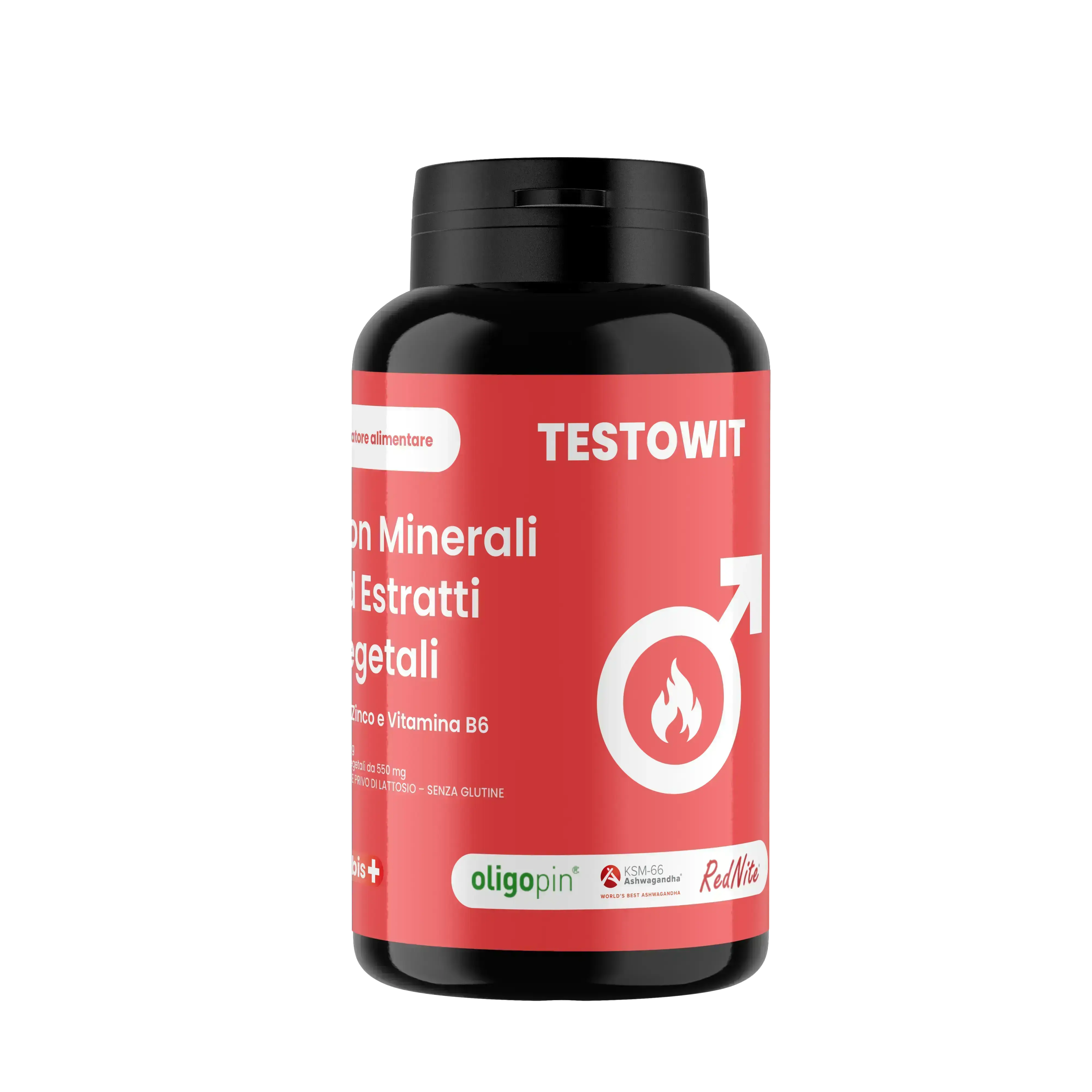 Muira puama (Ptychopetalum olacoides Benth.) corteccia e.s. (D/E: 4/1); RedNite™ [Barbabietola Rossa (Beta vulgaris L.) radice succo polvere tit. all’1,5% in nitrati]; Maca (Lepidium meyenii Walp.) radice e.s. tit. allo 0,5% in beta-ecdysterone; Fieno Greco (Trigonella foenum-graecum L.) semi e.s. tit. al 50% in protodioscina; gluconato di zinco; KSM-66® [Ashwagandha (Withania somnifera (L.) Dunal.) radice e.s. tit. al 5% in withanolidi]; agente di carica: cellulosa; Oligopin® [Pino Marittimo Francese (Pinus pinaster Ait.) corteccia e.s. tit. al 65% in procianidine oligomeriche (OPCs)]; agente antiagglomerante: sali di magnesio degli acidi grassi; Uva rossa (Vitis vinifera L.) semi e.s. tit. al 95% in proantocianidine; colecalciferolo; acetato di D-alfa-tocoferile; acido borico; gluconato di rame; cloridrato di piridossina; Piperina da Pepe nero (Piper nigrum L.) frutti.